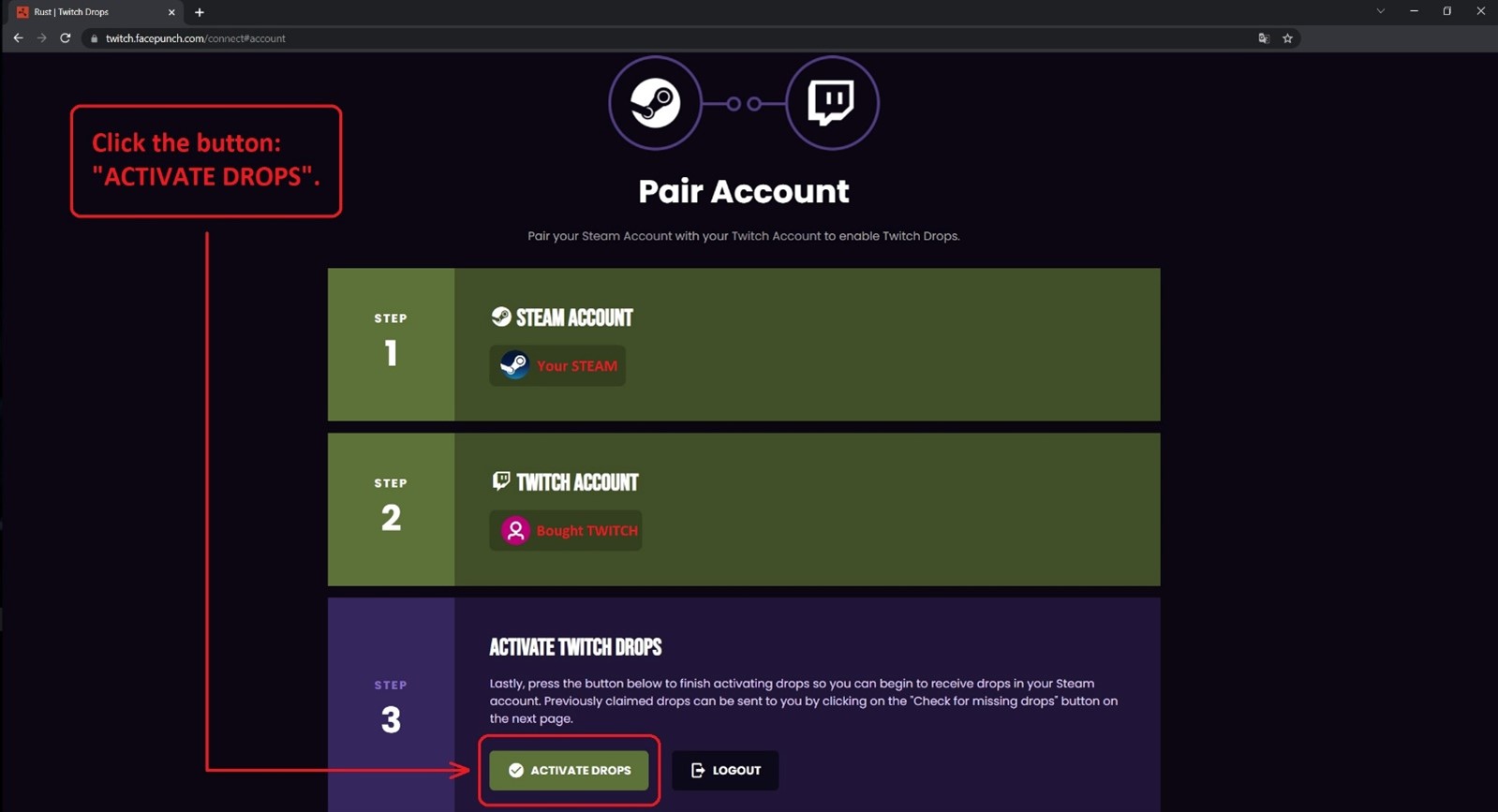 - Click on the “ACTIVATE DROPS” button. If you are not redirected to the right page, open it yourself using the link twitch.facepunch.com/connect or click on "CONNECT ACCOUNT" at the top.
