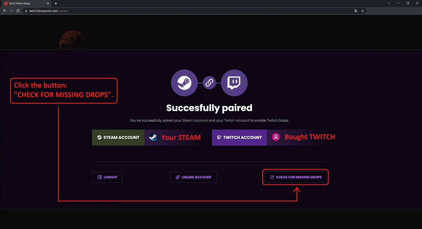 If you are not redirected anywhere and you still remain on this page, it means that you ignored the text when issuing the product, the instructions, the screaming red text in paragraph 4 and linked the Twitch first. Dont worry. You need to unlink Twitch first, and then Steam (LOGOUT BUTTON, KEEP IN ORDER) and do everything from the very beginning according to the instructions, this time without missing the points, otherwise you won’t be able to get to point 9.