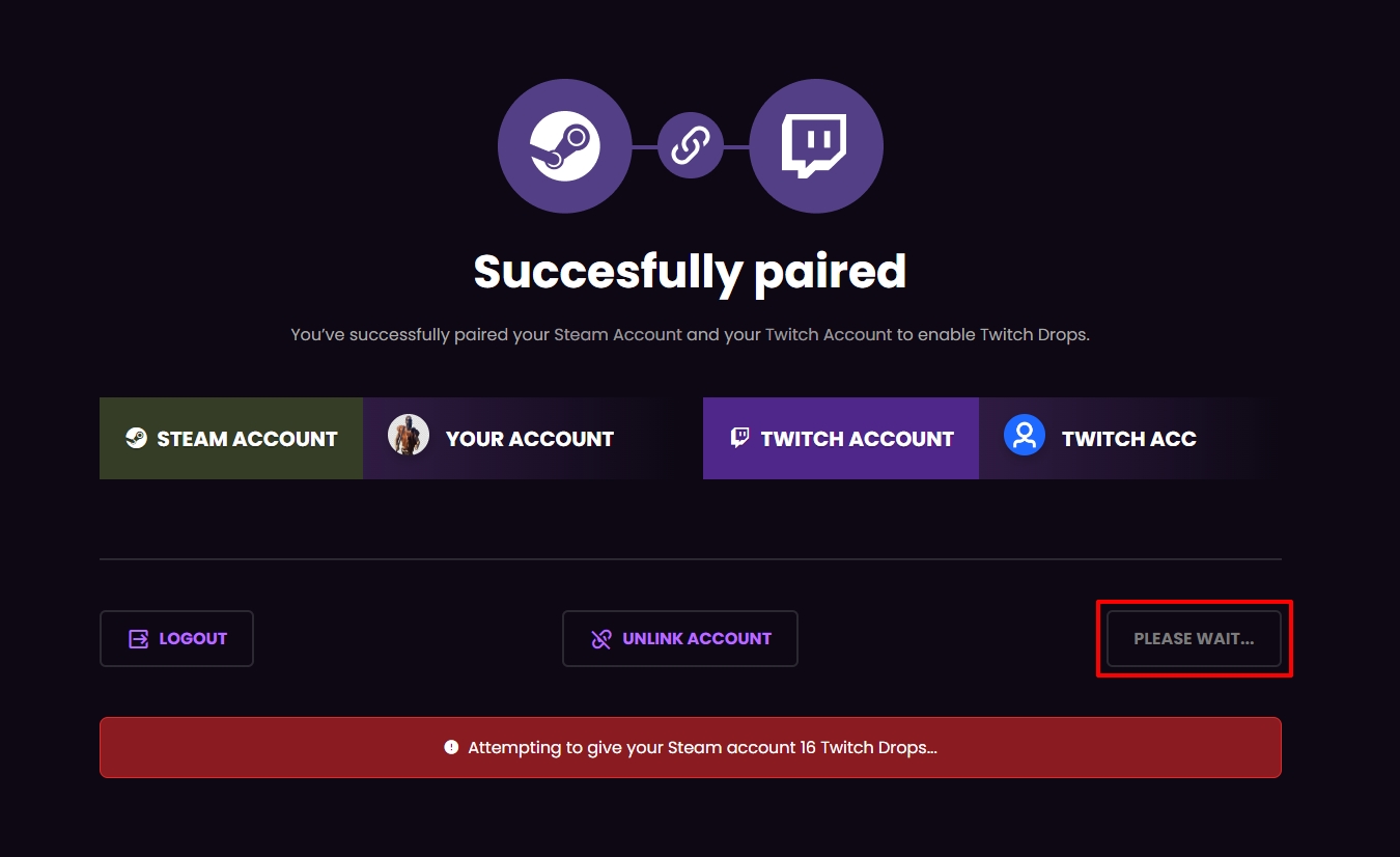VERY IMPORTANT! FIRST YOU NEED TO CONNECT YOUR STEAM ACCOUNT, NOT PURCHASED TWITCH ACCOUNT, OTHERWISE YOU WILL NOT BE ABLE TO RECEIVE ITEMS.
