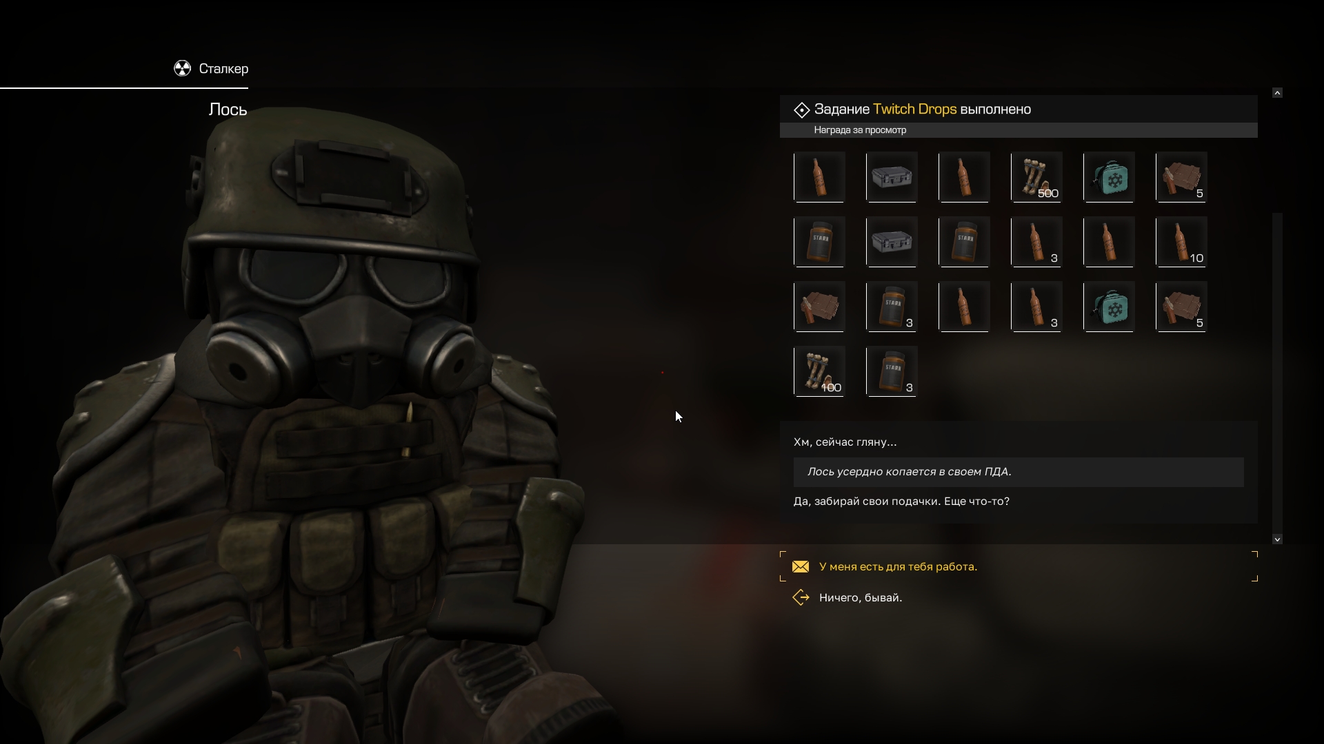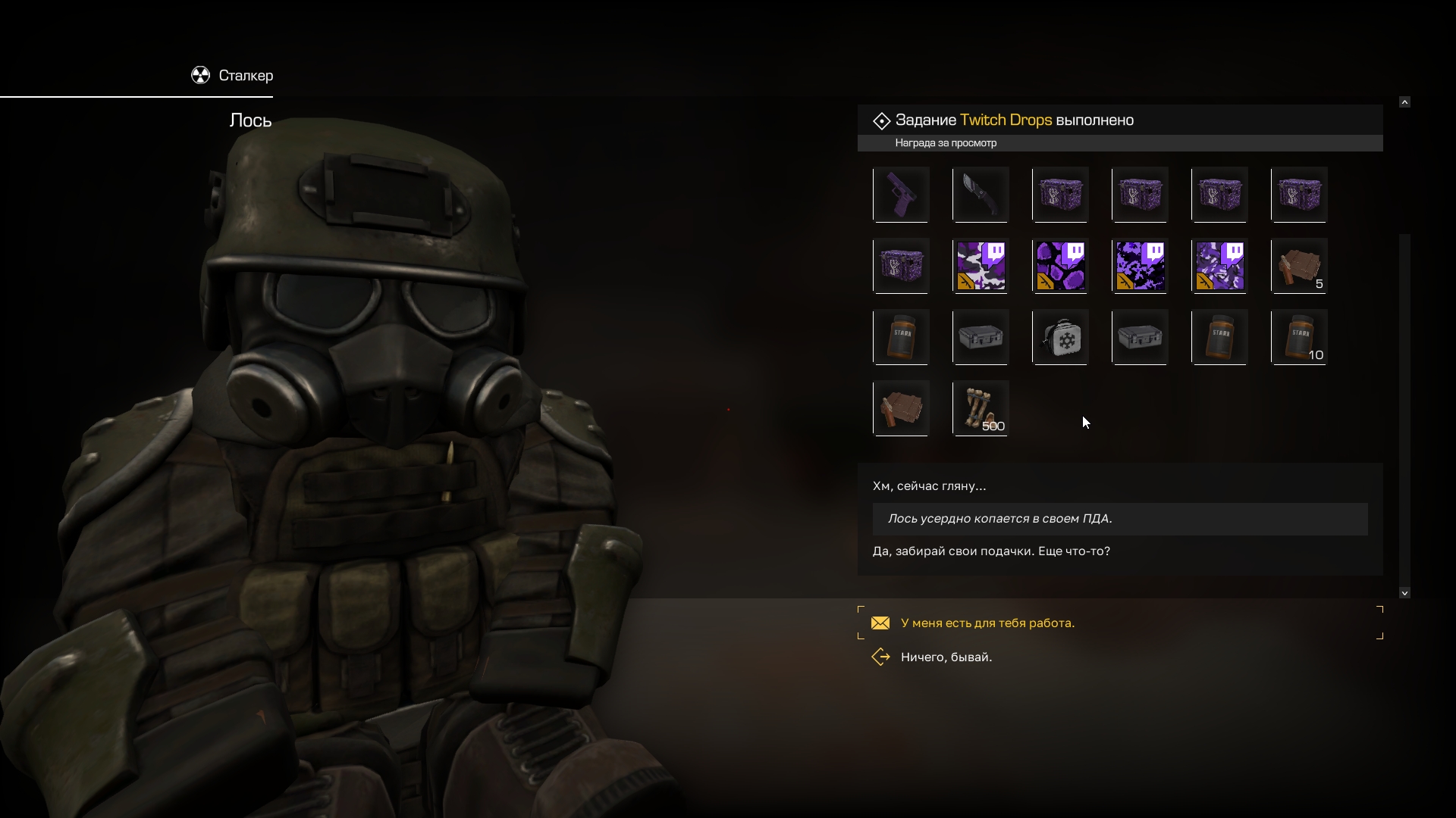 - If you havent used the courier before this moment, you need to go through the entire dialogue with him (to the inventory), close the inventory, and then press F again, then you will have an active phrase with the inscription “Twitch Drops”, by clicking on it, 20 slots with items will immediately go to your inventory.